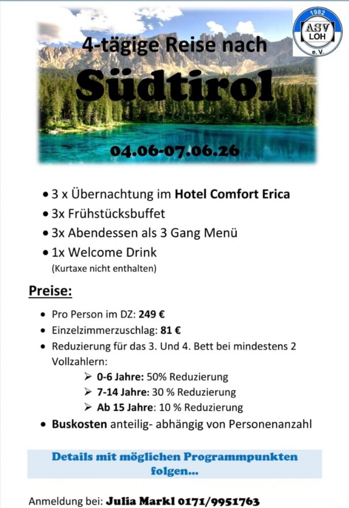 Der Vereinsausflug 2026 geht vom 4.6 bis 7.6 in das schöne Salurn in Südtirol. Im Preis inkludiert sind 3 Übernachtungen mit Frühstück und Abendessen. Buskosten exklusive.